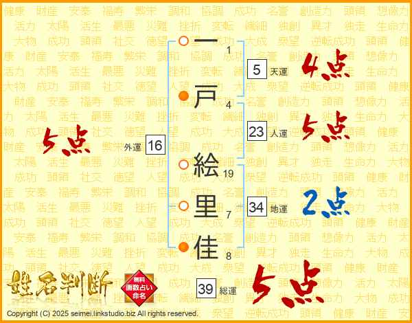 一(1画)戸(4画) 絵(19画)里(7画)佳(8画)