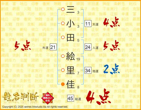 三(3画)小(3画)田(5画) 絵(19画)里(7画)佳(8画)