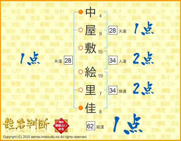 中(4画)屋(9画)敷(15画) 絵(19画)里(7画)佳(8画)