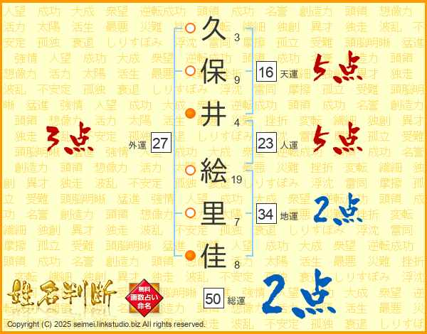 久(3画)保(9画)井(4画) 絵(19画)里(7画)佳(8画)
