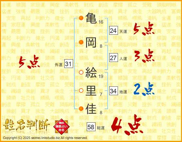 亀(16画)岡(8画) 絵(19画)里(7画)佳(8画)