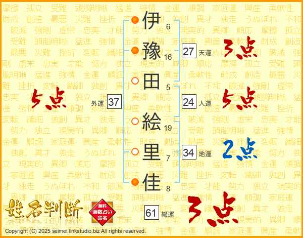 伊(6画)豫(16画)田(5画) 絵(19画)里(7画)佳(8画)
