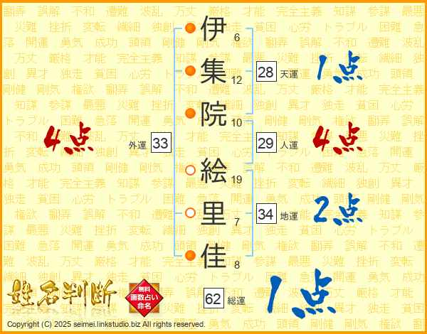 伊(6画)集(12画)院(10画) 絵(19画)里(7画)佳(8画)
