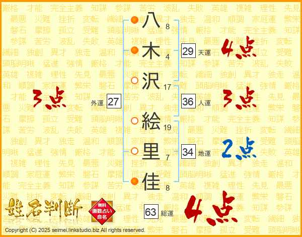 八(8画)木(4画)沢(17画) 絵(19画)里(7画)佳(8画)
