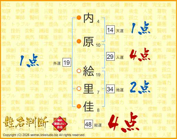 内(4画)原(10画) 絵(19画)里(7画)佳(8画)