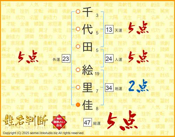 千(3画)代(5画)田(5画) 絵(19画)里(7画)佳(8画)