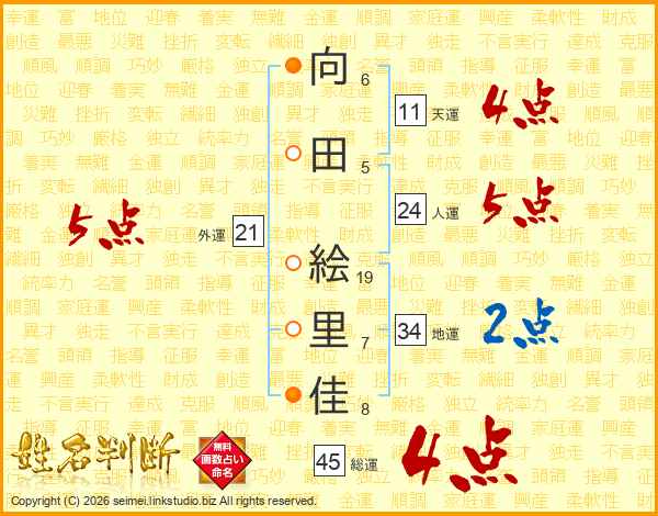 向(6画)田(5画) 絵(19画)里(7画)佳(8画)