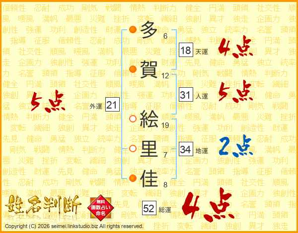 多(6画)賀(12画) 絵(19画)里(7画)佳(8画)