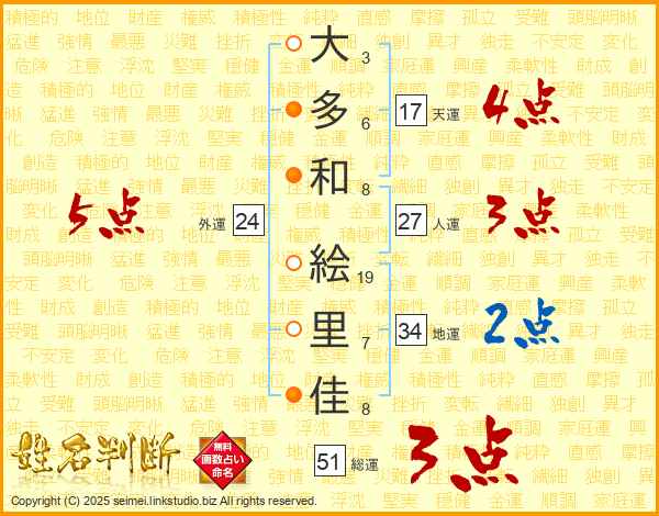 大(3画)多(6画)和(8画) 絵(19画)里(7画)佳(8画)