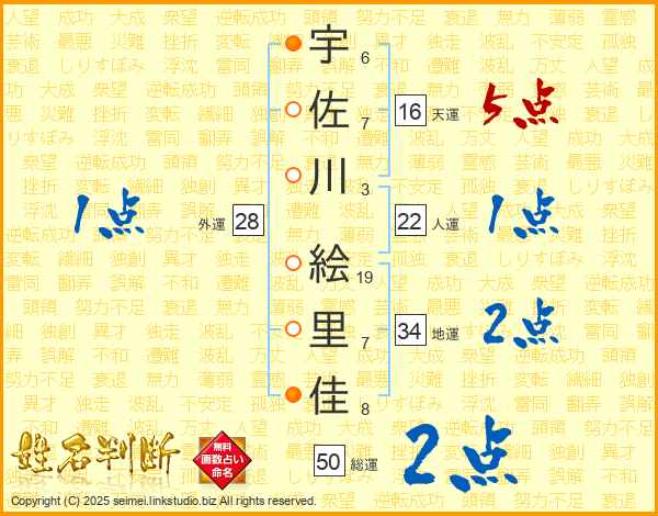 宇(6画)佐(7画)川(3画) 絵(19画)里(7画)佳(8画)