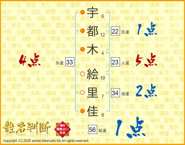 宇(6画)都(12画)木(4画) 絵(19画)里(7画)佳(8画)