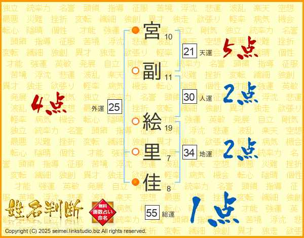 宮(10画)副(11画) 絵(19画)里(7画)佳(8画)