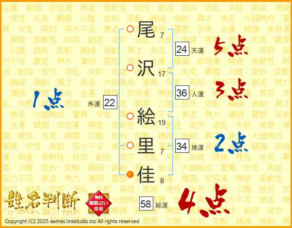 尾(7画)沢(17画) 絵(19画)里(7画)佳(8画)