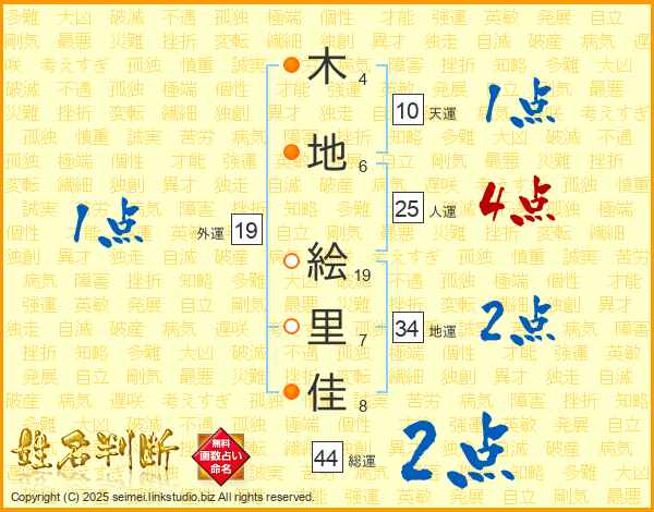 木(4画)地(6画) 絵(19画)里(7画)佳(8画)