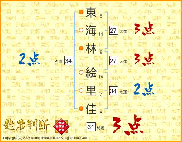 東(8画)海(11画)林(8画) 絵(19画)里(7画)佳(8画)
