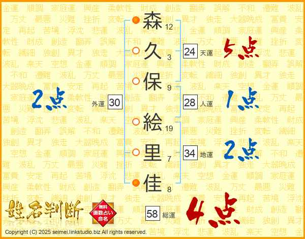 森(12画)久(3画)保(9画) 絵(19画)里(7画)佳(8画)