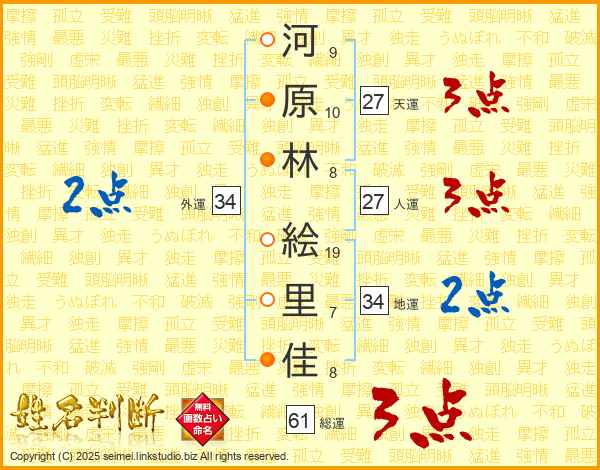 河(9画)原(10画)林(8画) 絵(19画)里(7画)佳(8画)