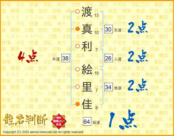 渡(13画)真(10画)利(7画) 絵(19画)里(7画)佳(8画)