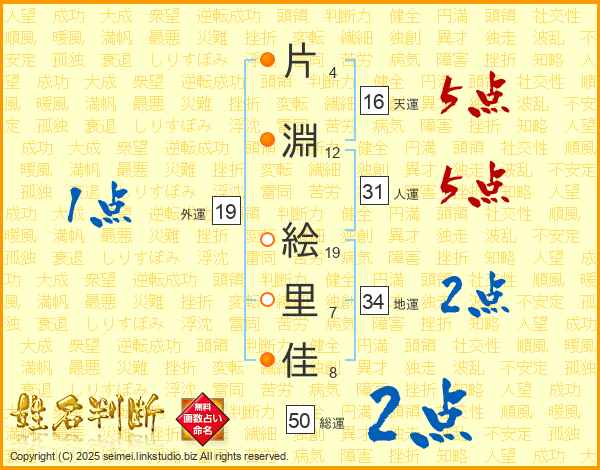片(4画)淵(12画) 絵(19画)里(7画)佳(8画)