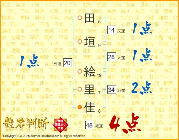 田(5画)垣(9画) 絵(19画)里(7画)佳(8画)