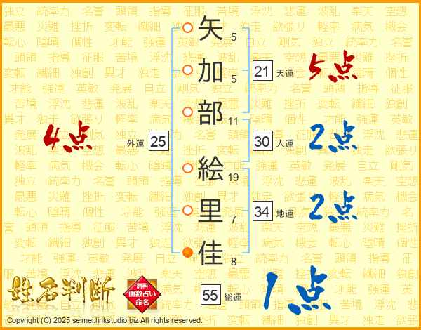矢(5画)加(5画)部(11画) 絵(19画)里(7画)佳(8画)