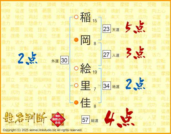 稲(15画)岡(8画) 絵(19画)里(7画)佳(8画)
