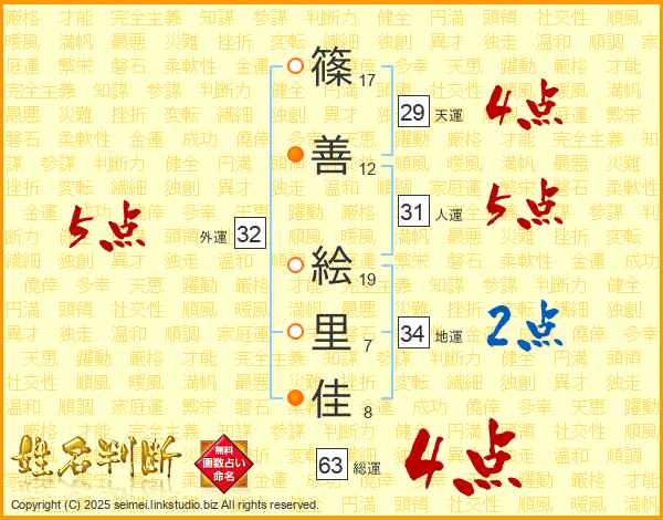 篠(17画)善(12画) 絵(19画)里(7画)佳(8画)