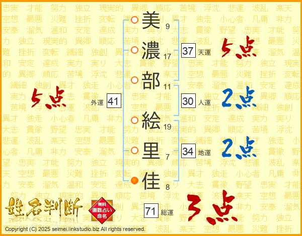 美(9画)濃(17画)部(11画) 絵(19画)里(7画)佳(8画)
