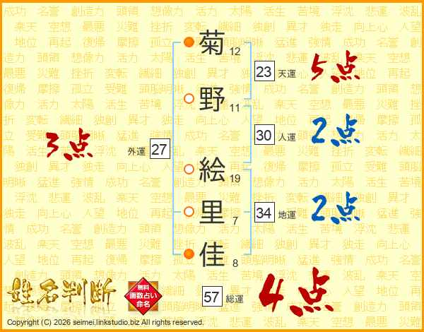 菊(12画)野(11画) 絵(19画)里(7画)佳(8画)