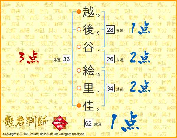 越(12画)後(9画)谷(7画) 絵(19画)里(7画)佳(8画)