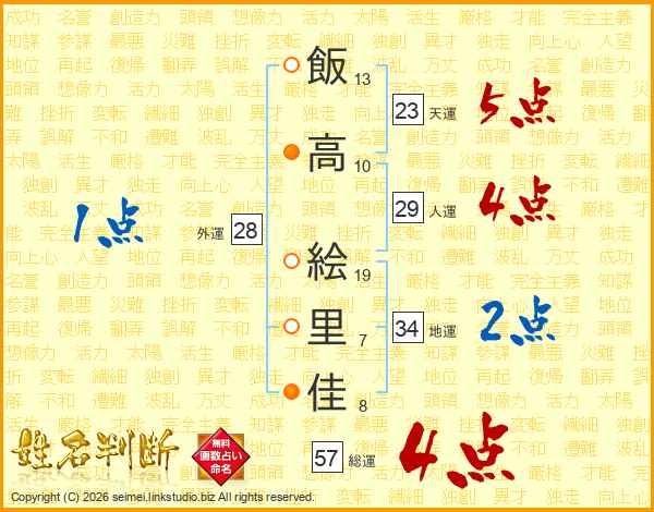 飯(13画)高(10画) 絵(19画)里(7画)佳(8画)