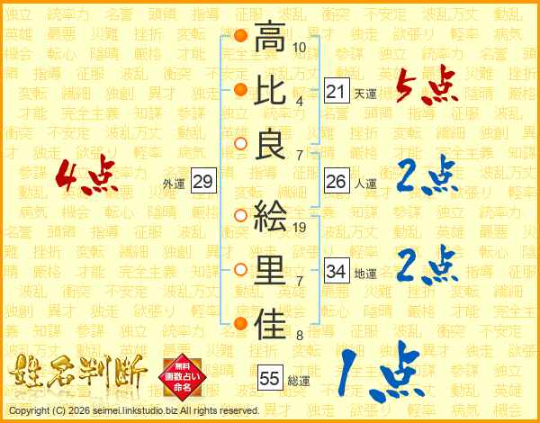高(10画)比(4画)良(7画) 絵(19画)里(7画)佳(8画)