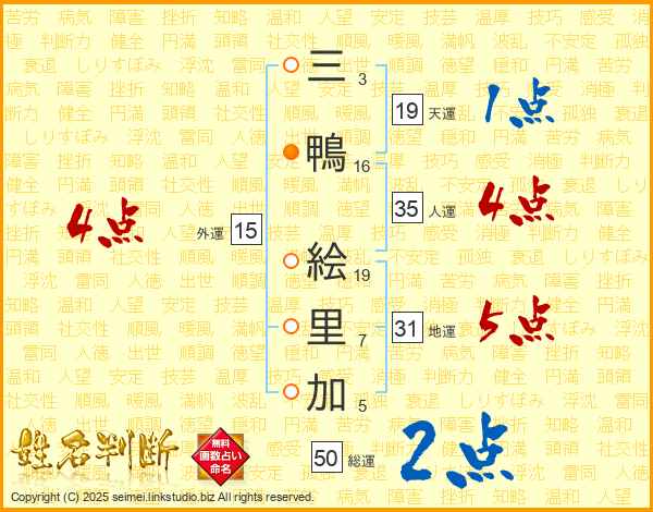 三(3画)鴨(16画) 絵(19画)里(7画)加(5画)