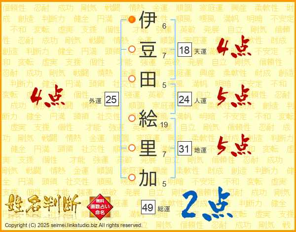 伊(6画)豆(7画)田(5画) 絵(19画)里(7画)加(5画)