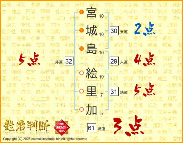 宮(10画)城(10画)島(10画) 絵(19画)里(7画)加(5画)