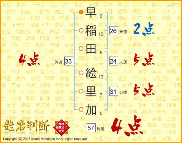 早(6画)稲(15画)田(5画) 絵(19画)里(7画)加(5画)