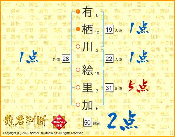 有(6画)栖(10画)川(3画) 絵(19画)里(7画)加(5画)