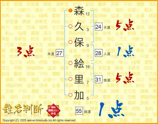 森(12画)久(3画)保(9画) 絵(19画)里(7画)加(5画)