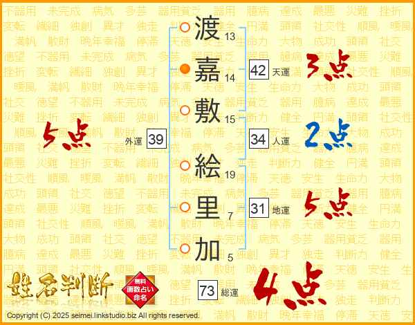 渡嘉敷絵里加さんの総運は73画の4点
