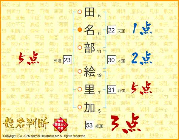 田(5画)名(6画)部(11画) 絵(19画)里(7画)加(5画)