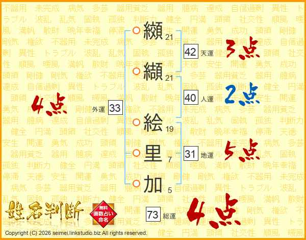 纐(21画)纈(21画) 絵(19画)里(7画)加(5画)