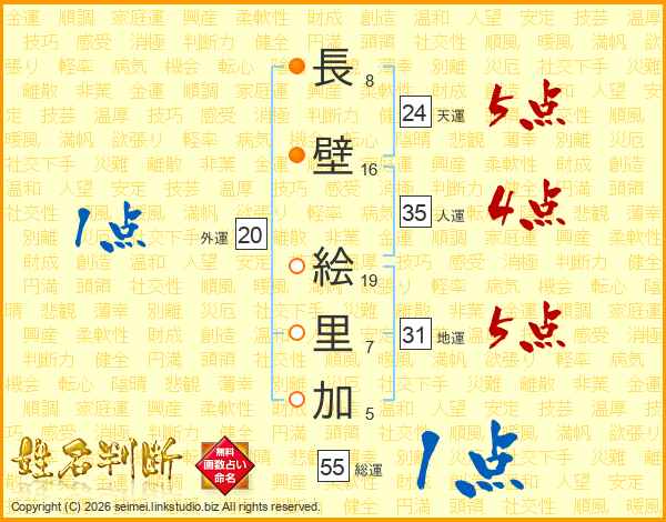 長(8画)壁(16画) 絵(19画)里(7画)加(5画)