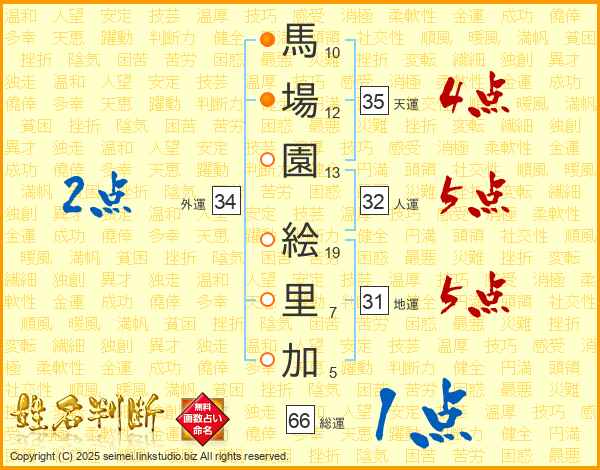 馬(10画)場(12画)園(13画) 絵(19画)里(7画)加(5画)