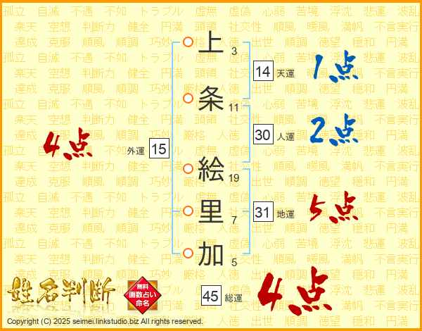 生活面を象徴する運勢です。外部から受ける影響力を表し、結婚運、家庭運や職場、環境への順応性を表します。総運から人運を引いた画数。姓や名が1文字の場合を除く。