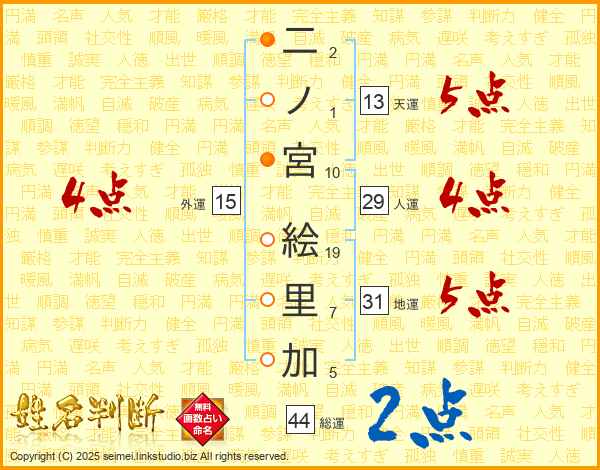二(2画)ノ(1画)宮(10画) 絵(19画)里(7画)加(5画)