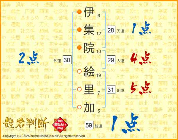 伊(6画)集(12画)院(10画) 絵(19画)里(7画)加(5画)