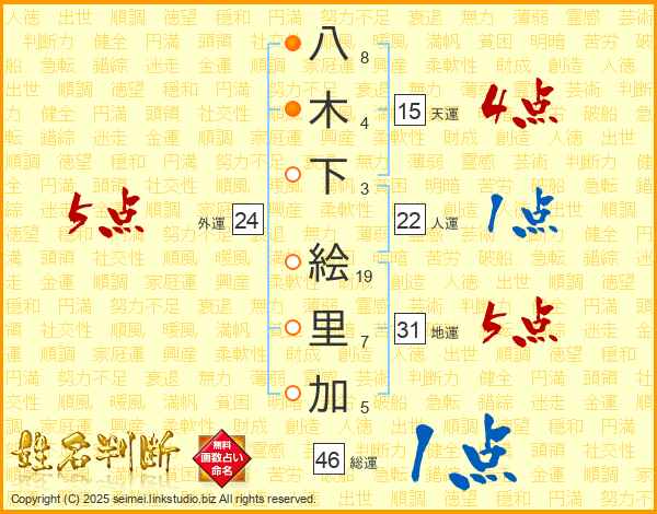 八(8画)木(4画)下(3画) 絵(19画)里(7画)加(5画)