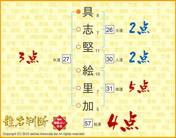 具(8画)志(7画)堅(11画) 絵(19画)里(7画)加(5画)