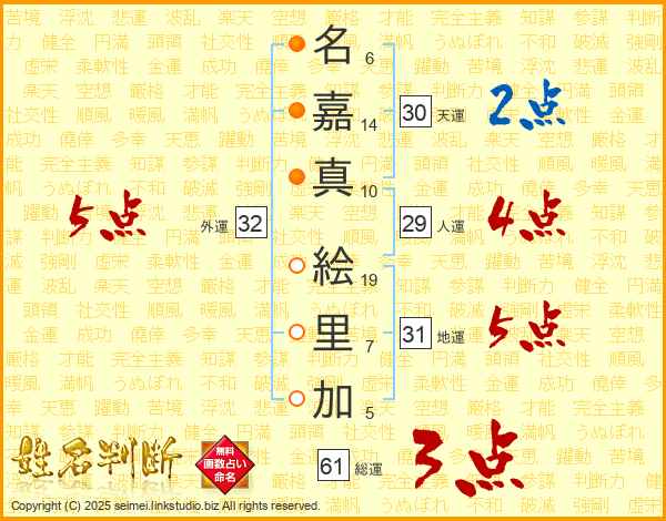 名(6画)嘉(14画)真(10画) 絵(19画)里(7画)加(5画)