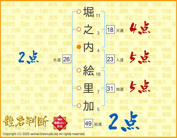 堀(11画)之(3画)内(4画) 絵(19画)里(7画)加(5画)